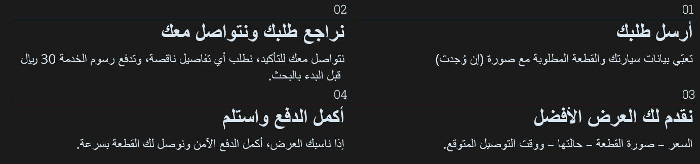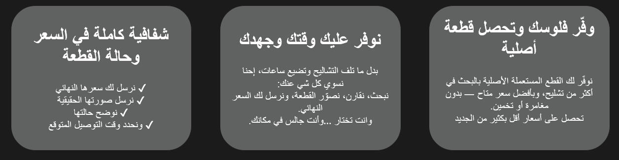 نوفر لك قطع الغيار المستعملة الأصلية بأفضل سعر، مع صورة للقطعة خلال 72 ساعة. رسوم الخدمة 30 ريال فقط، وفي حال عدم التوفر، تسترجع المبلغ كاملاً.
